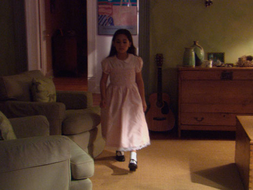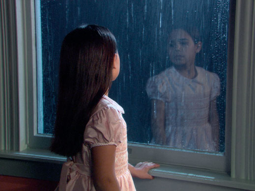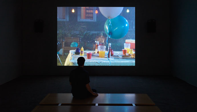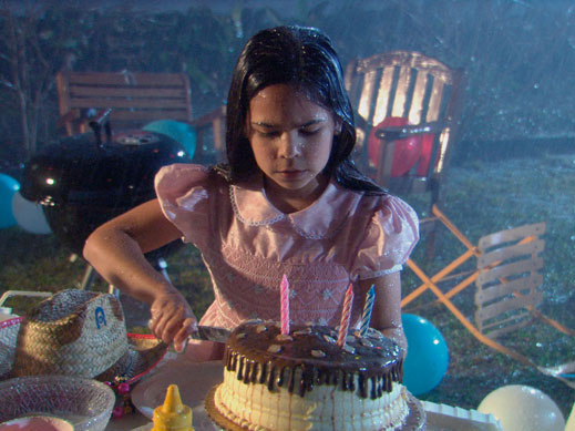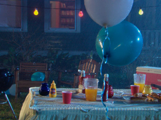'Eight' revolves around a birthday party, a young girl and a house on a rainy night. The camera work in Eight is a steady dolly movement from one room interior to another. Slowly, the camera reveals that the interior room is an exterior space, a suburban backyard in the middle of a rain storm. As the camera moves through this backyard, this exterior, in turn, is revealed to be an interior room. The sense of inside and outside is interlaced and the appearance of real shelter continually shifts throughout the video. The storm appears both inside and outside, following the young girl, who walks from one space to the other, trying to salvage the birthday cake.