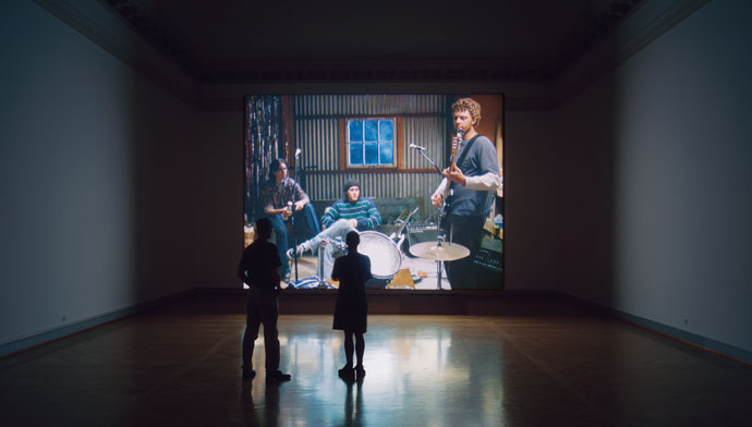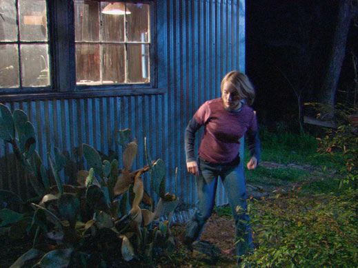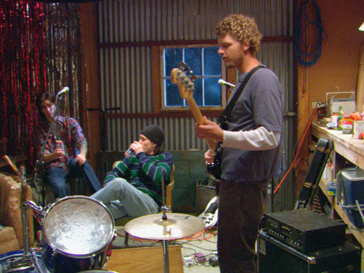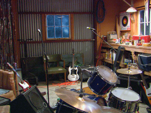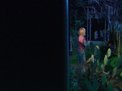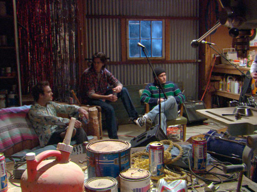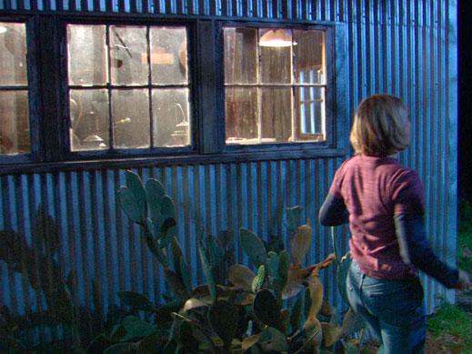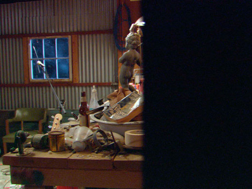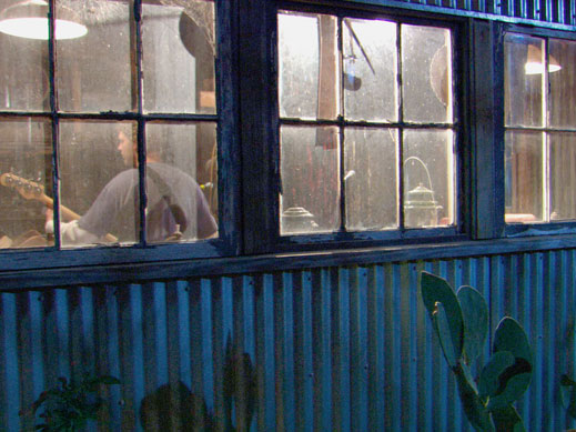 In 'Detached Building', the camera is in a continual state of motion. Like an unblinking eye, the camera travels along a track running inside a tin shed, passing through a wall and out into a rural backyard landscape. It is evening and the old tin shed is cluttered with tools, household junk, beer cans and music equiment. Outside the shed, the landscape is strewn with other forgotten construction debris. At the back of the yard, we see a large skeletal structure of an two storey, unfinished building. As the camera passes from inside to outside, a rock band appears within the shed, in the midst of a rehersal session. Outside, a teenage girl appears, in the process of throwing rocks at the