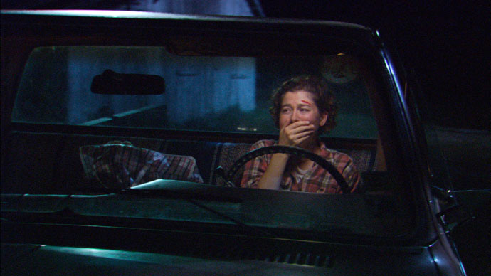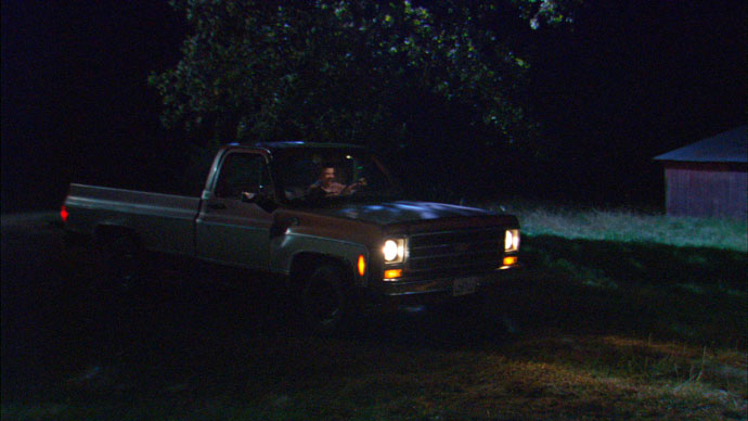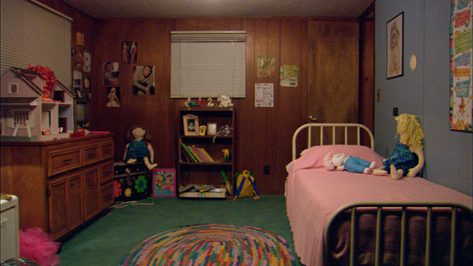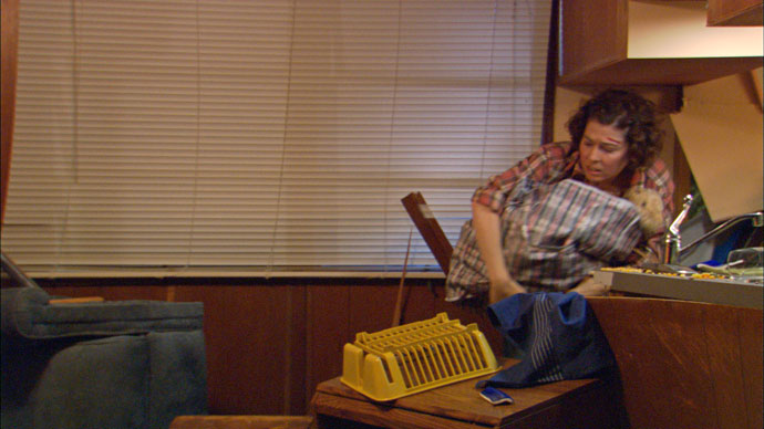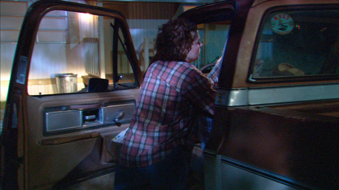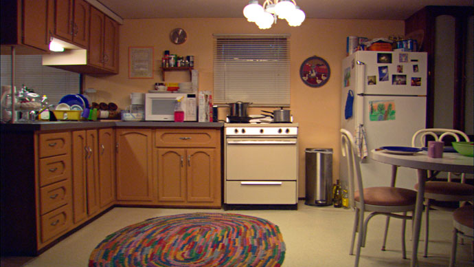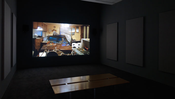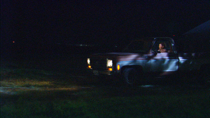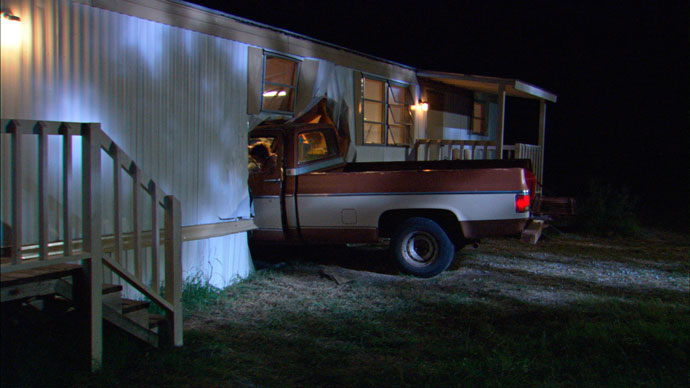 'Single Wide' revolves around a trailer house, a woman and a pickup truck. In the video, it is evening and the house stands in a landscape in the middle of the countryside. The camera travels in one steady movement, like an unblinking eye, circling the exterior of the house, the surrounding landscape and passing through exterior walls of the house to the interior. Inside there is a young girl's bedroom, a living room, kitchen, bathroom and parents' bedroom. We see the woman alone, carrying a bag with what appears to be the belongings of a young girl, walking through the rooms of the house. She exits her home and walks to a pickup truck parked outside. The truck engine is running and the woman sits inside in an upset and agitated state. It appears as if she is preparing to drive away. Instead, she drives forward, colliding directly into the house she has just left. Seen from the outside, the truck sticks halfway out of the front facade of the house. From within, the front cabin becomes an architectural extension, a room inside the room. With the woman as the central aggressive