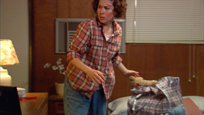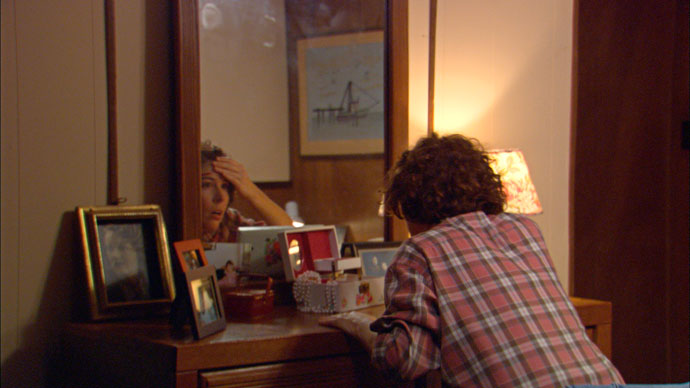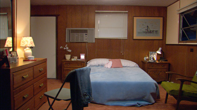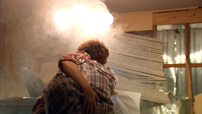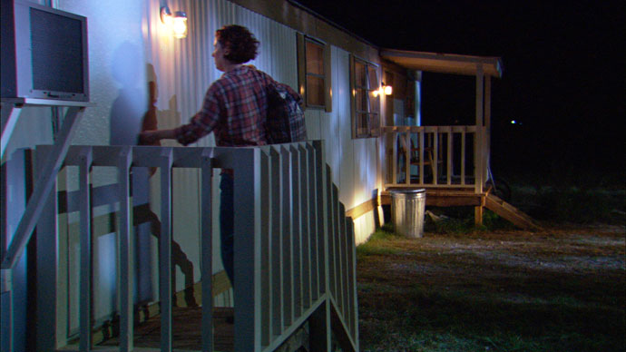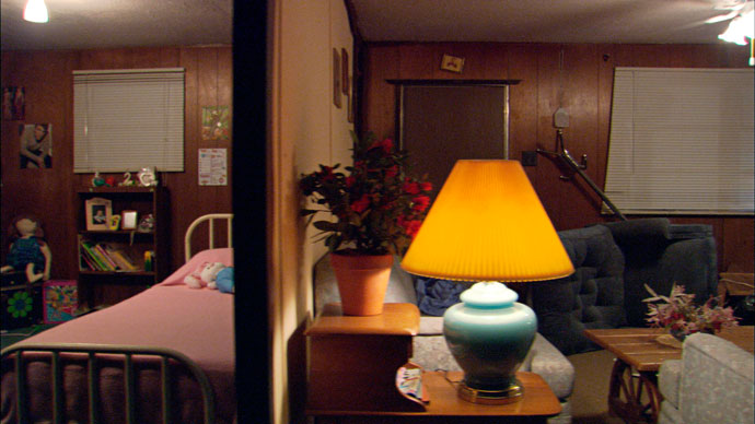 force, the narrative of these two architectural spaces and the depiction of the house as an embodiment of her past present and future, collide with one another in an unfolding, relentless cycle. The sense of entrance and exit, inside and outside, before and after is completely interlaced. Interior rooms and architectural thresholds within the house become synonymous with the appearance of frames on a strip of film. In "Single Wide," the narrative potential is built upon the deconstruction of the set. Reminiscent of some of the architectural interventions of Gordon Matta Clark, the house has been physically split in half in order to enable a moving camera to pass seamlessly from room to room, inside to outside. The camera movement implies a fracturing of the domestic space and echoes the physical and psychological turmoil of the woman. Single Wide was shot on location in Elgin, Texas in 2002.